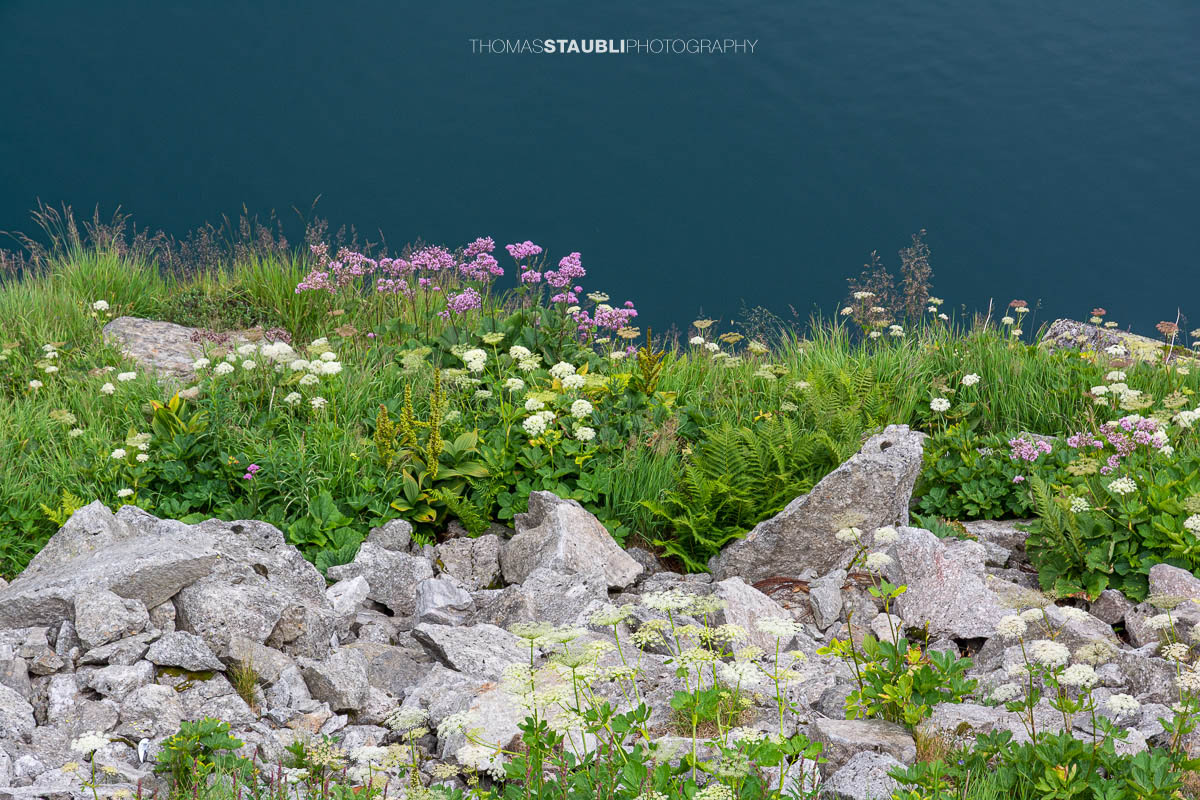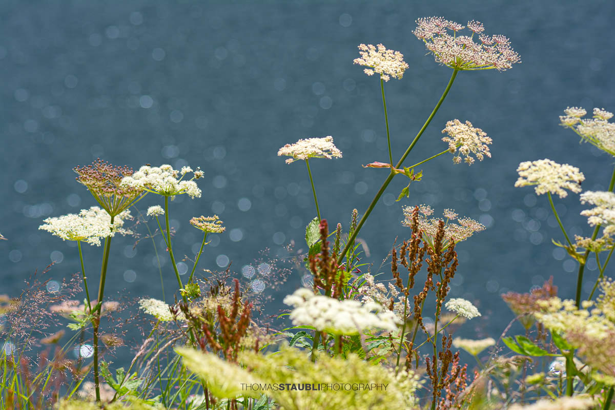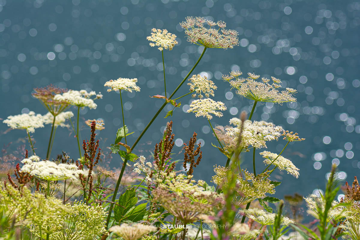 Die weissen, schirmförmigen Blüten des Wiesen-Bärenklaus setzen helle Akzente im Grün und sind ein charakteristisches Element nährstoffreicher Bergwiesen. Inmitten dieser Blütenpracht stehen die markanten, breit gefalteten Blätter des Weissen Germers, einer typischen, aber hochgiftigen Alpenpflanze, die feuchte Standorte bevorzugt. Gemeinsam bilden diese Arten eine artenreiche, natürliche Vegetation, wie sie für alpine Seeufer oberhalb der Waldgrenze charakteristisch ist.
