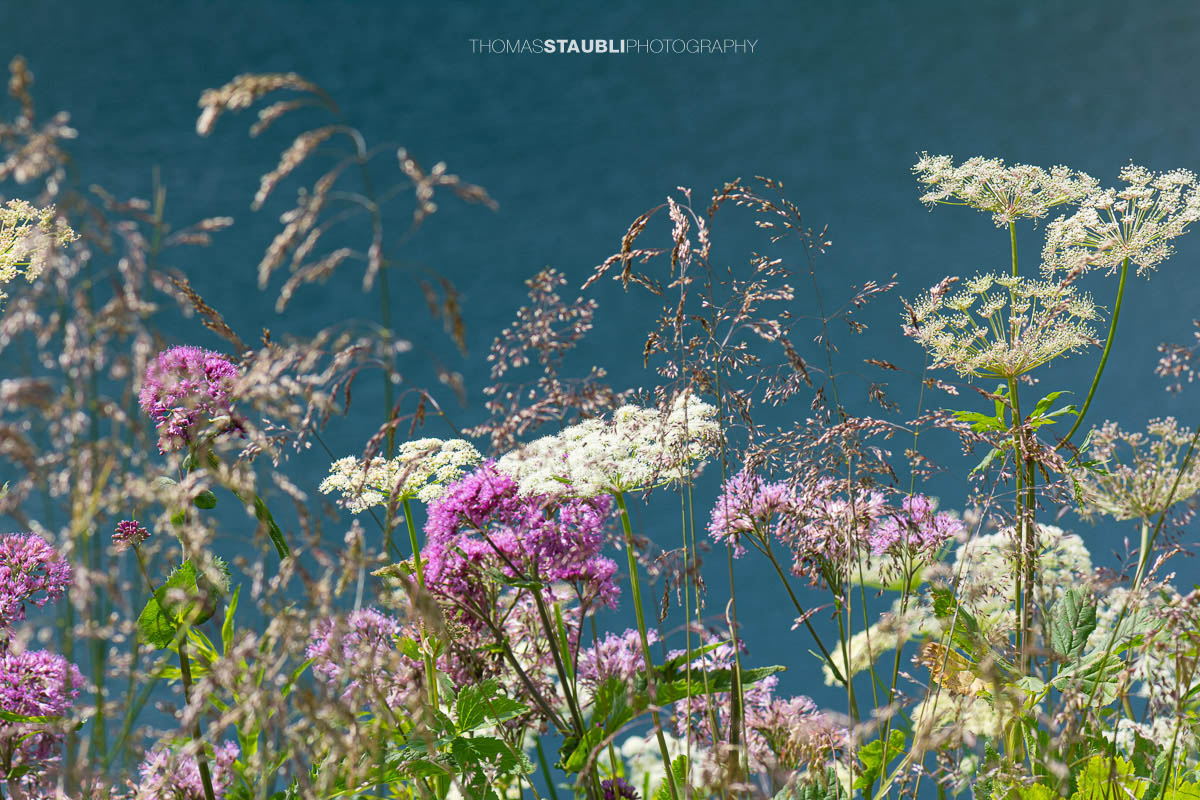 Am Ufer des Lago di Lucendro prägt eine typische subalpine Pflanzengemeinschaft das Bild. Zwischen Gräsern und feuchten Wiesenstandorten wachsen auffällige Blütenstauden, die an das kurze, aber intensive alpine Sommerhalbjahr angepasst sind. Besonders ins Auge fällt das Schmalblättrige Weidenröschen, dessen leuchtend purpurrosa Blütenkerzen im Hochsommer weithin sichtbar sind und zahlreiche Insekten anziehen. Daneben blüht der Baldrian mit seinen zarten rosa bis lilafarbenen, halbkugeligen Blütenständen, eine klassische Ufer- und Feuchtwiesenpflanze der Alpen.